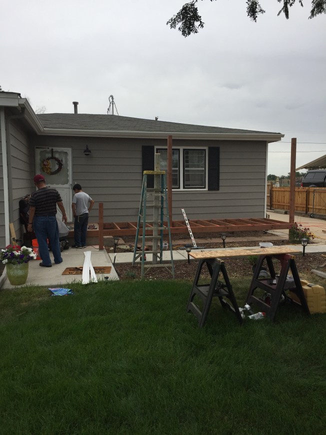 Decking almost done.  Ledgers going up, rafters, stairs and railing still to go. It’s going to be a pergola porch!