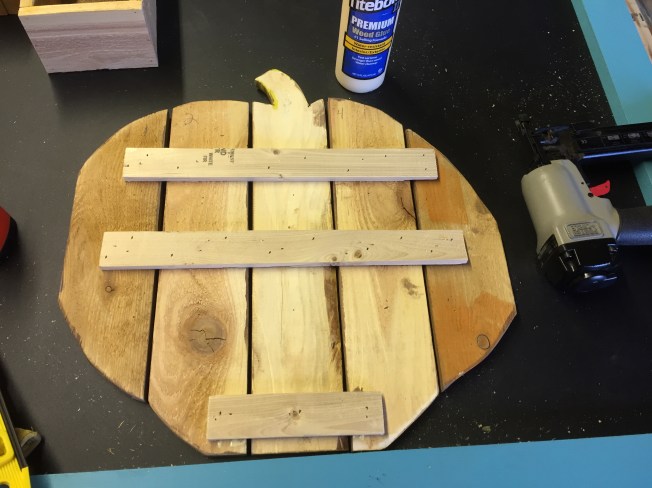 I then used wood glue and my nail gun to attach strips to the back to hold them together and to the bottom scrap for a stand.